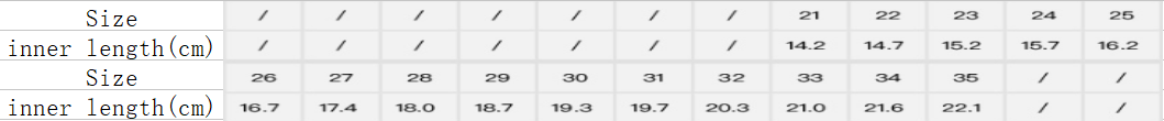 Size: 21 yards (inner length 14.2cm), 22 yards (inner length 14.7cm), 23 yards (inner length 15.2cm), 24 yards (inner length 15.7cm), 25 yards (inner length 16.2cm), 26 yards ( Inner length 16.7cm), 27 yards (inner length 17.4cm), 28 yards (inner length 18cm), 29 yards (inner length 18.7cm), 30 yards (inner length 19.3cm), 31 yards (inner length 19.7cm), 32 yards (inner length 20.3cm), 33 yards (inner length 21cm), 34 yards (inner length 21.6cm), 35 yards (inner length 22.1cm)